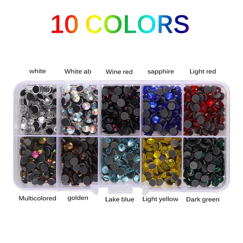 - Easy to Use The rhinestone applicator kit contains a total of 6200 rhinestone patches in different colors and sizes. One side of the thermosetting rhinestone is faceted, the other side is a flat surface coated with heat sensitive adhesive.