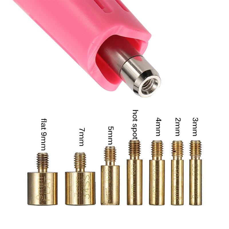 The rhinestone patch applicator features an on/off switch with a red LED indicator, a comfortable grip and an extra long cable. Fast heating times and qualities. Equipped with safety stand and 5 different applicator tips for applying Duroplast crystals in different sizes.
