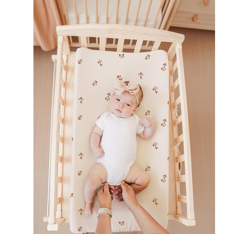 - Soft and Gentle Fabric: Our muslin changing pad cover is made from soft and gentle muslin fabric, providing a comfortable surface for your baby's diaper changes. The fabric is delicate against your baby's skin and retain its color after washed for several times.