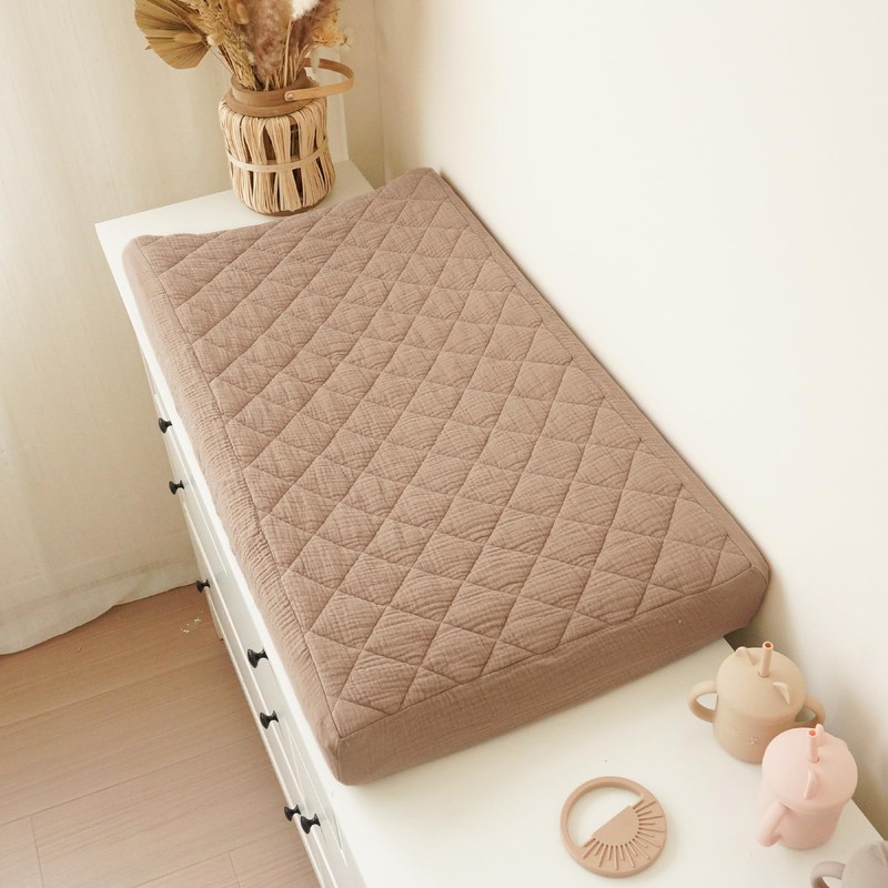 - Quilted and Soft Fabric: Our changing pad cover consists of three layers: the top layer is made of 100% cotton (muslin), which is soft and absorbent; the middle layer is quilted with soft padding to ensure coziness and comfort; and the bottom layer is made of 100% waterproof polyester to protect the pad from wetting. Our unique design provides a comfortable touch for your baby while ensuring waterproof functionality, making our changing pad soft and perfect for delicate baby skin.