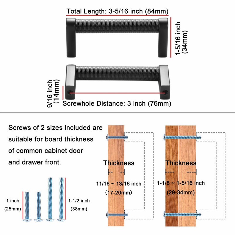 - Free screws of 25mm & 38mm included are suitable for board thickness of common cabinet door and drawer front.
