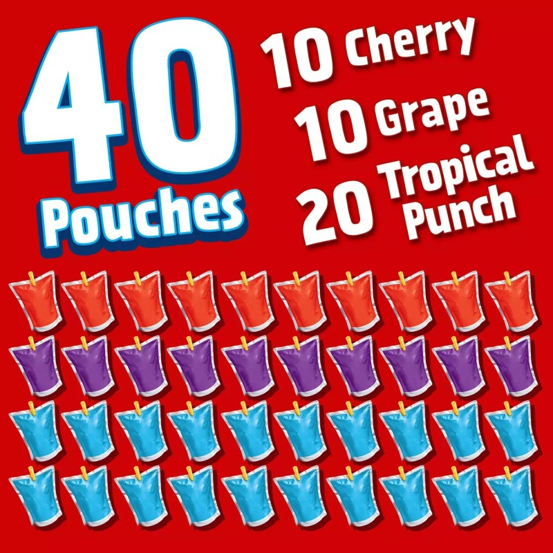 - Flavors 20 tropical punch, 10 cherry, 10 grape artificially flavored drink pouches
