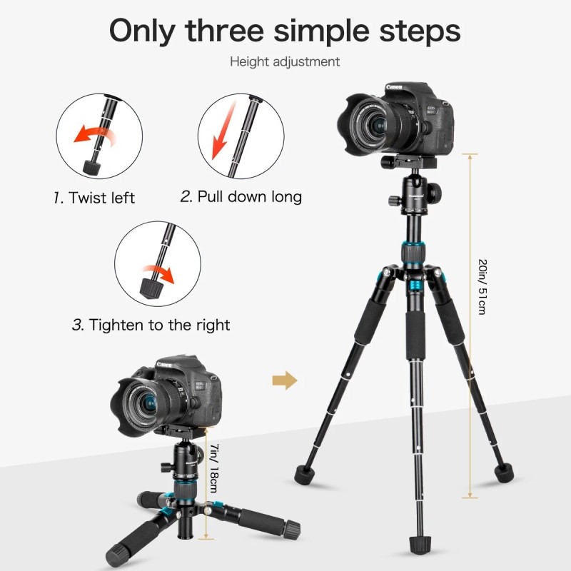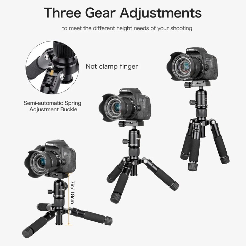 :)Tripod mini height reaches 7inch/18cm, so it is the best choice for macro shooting with smaller size, lighter weight and closer distance It is also a solution for you to have ground level shooting.