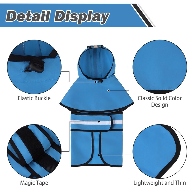 - Conveniently Use: There is a hook & loop strap on the chest and an elastic buckle to fix the hat on the dog's head in comfort. The lightweight and thin fabric makes it easy to wear and take off the coat. There is a hole on the back of a raincoat, this is designed for a leash or handle and to travel.