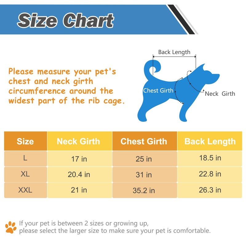 - Size XL: Neck girth 20.39"; Chest girth 31.49"; Back length 22.83". We recommend that use our size chart for more fit and comfortable, measure your dog's size then choose the size your pet needs.