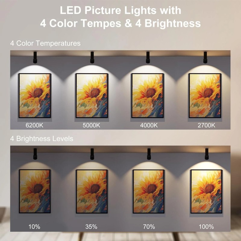 【Adjustable Lighting Area Size】Wireless LED painting lights for wall adopts an innovative scalable new design. The size of the lighting area can be DIYed at will to meet the lighting area of different lighting objects. Dimmable ceiling picture lamps has 4 levels of brightness and 4 color temperatures adjustable. CRI≥95, with excellent color reproduction.