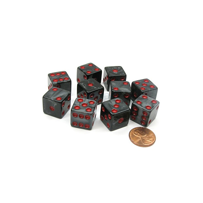 Koplow Games Set of 10 D6 16mm Marbleized Square Corner Dice - Charcoal with Red Pips