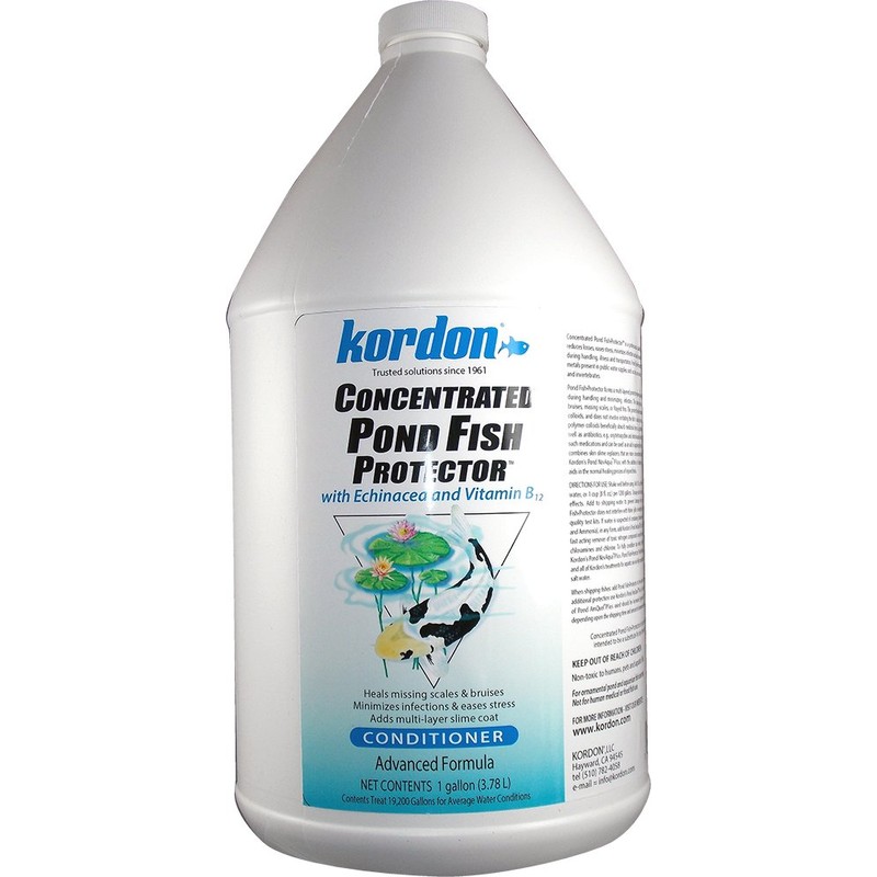 Kordon's Fish Protector is a water conditioner focused on healing. Fish Protector acts to reduce losses during handling. It helps heal injuries associated with missing scales and bruises as soon as it is added to ponds. Does not interfere with biological filtration. It does not affect the pH of water.