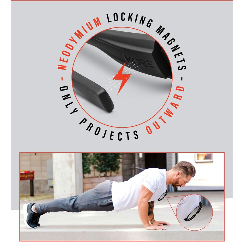 - KORE SUNGLASSES LOCK TO YOUR CLOTHES: Smart Magnets hidden inside each arm let you Fold & Lock Kore sunglasses to your shirt, jacket or gear when not in use. Never drop your glasses again.