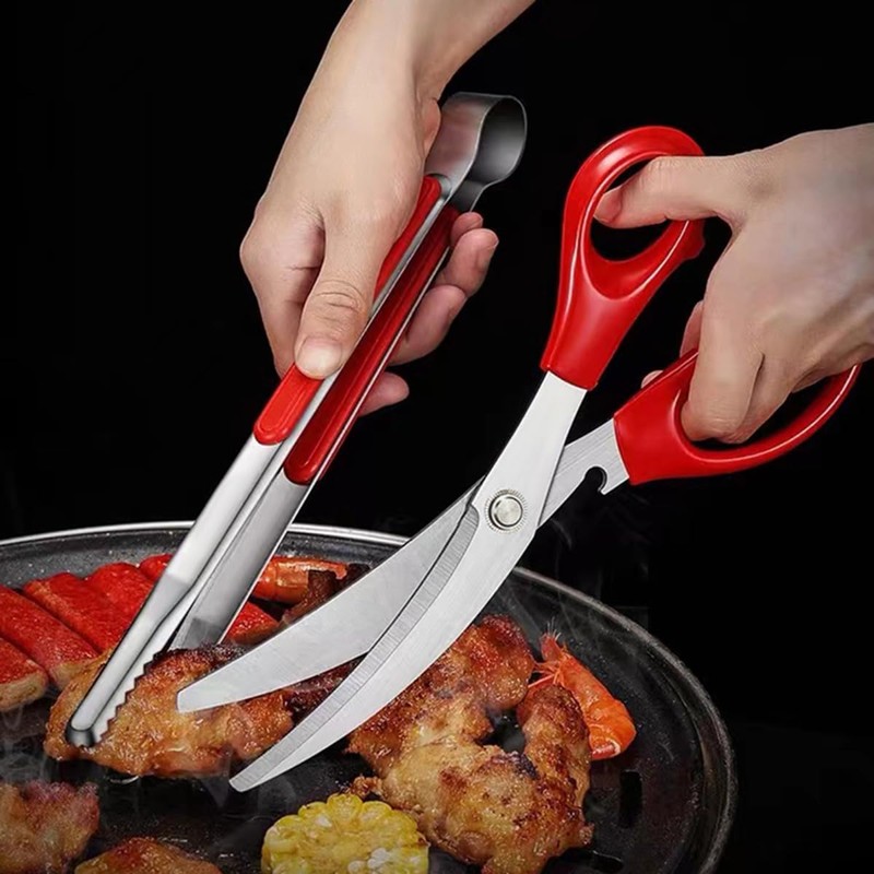 Elevate your culinary experience with this versatile Korean barbecue scissors, tongs and Silicone Basting Brush set. Crafted from premium stainless steel, these multipurpose tools are designed for effortless cutting and handling of meat, chicken, vegetables, and more. The sharp, serrated blades glide smoothly through tough ingredients, while the non-slip handles provide a secure grip. The included tongs allow you to easily grab and transfer food items. Perfect for barbecues, this set combines functionality and durability. Upgrade your cooking arsenal with this essential kitchen shears, tongs and Silicone Basting Brush set.