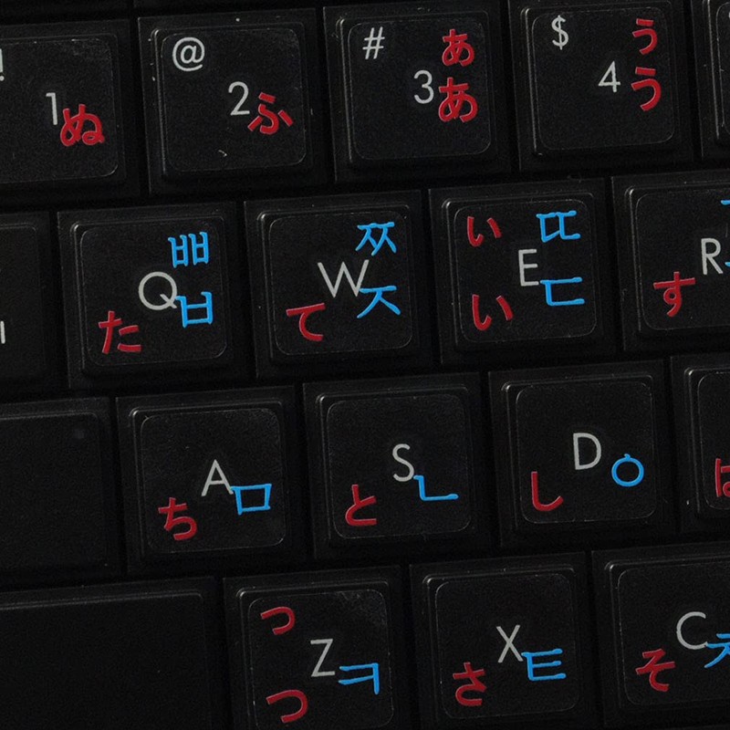KOREAN - JAPANESE HIRAGANA KEYBOARD LABELS ON TRANSPARENT BACKGROUND with RED & BLUE LETTERING (14X14)