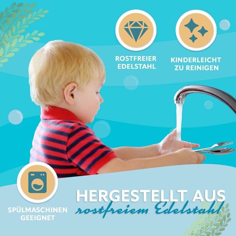 - 🐬 HOCHWERTIGER EDELSTAHL: Kinder-Gabel, Kinder-Löffel und der kleine Löffel bestehen aus rostfreiem, hochwertigen 18/8-Edelstahl, das Messer aus rostfreiem 13/0-Edelstahl. Damit ist das Kinder Besteck nicht nur sehr robust, sondern auch spülmaschinengeeignet.