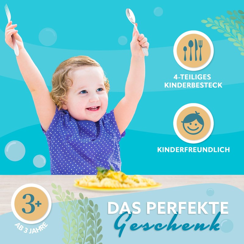 - 🐬 4-TEILIGES BESTECKSET: Im Kinderbesteck Set aus rostfreien Edelstahl ist eine Kindergabel, ein Kindermesser, ein Kinderlöffel sowie ein kleiner Löffel enthalten. Mit seiner handlichen Größe (Länge 17,3/18,8/17,2/14,3 cm) und abgerundeten Kanten eignet sich das Kinder Besteck Set auch für größere Kinder.