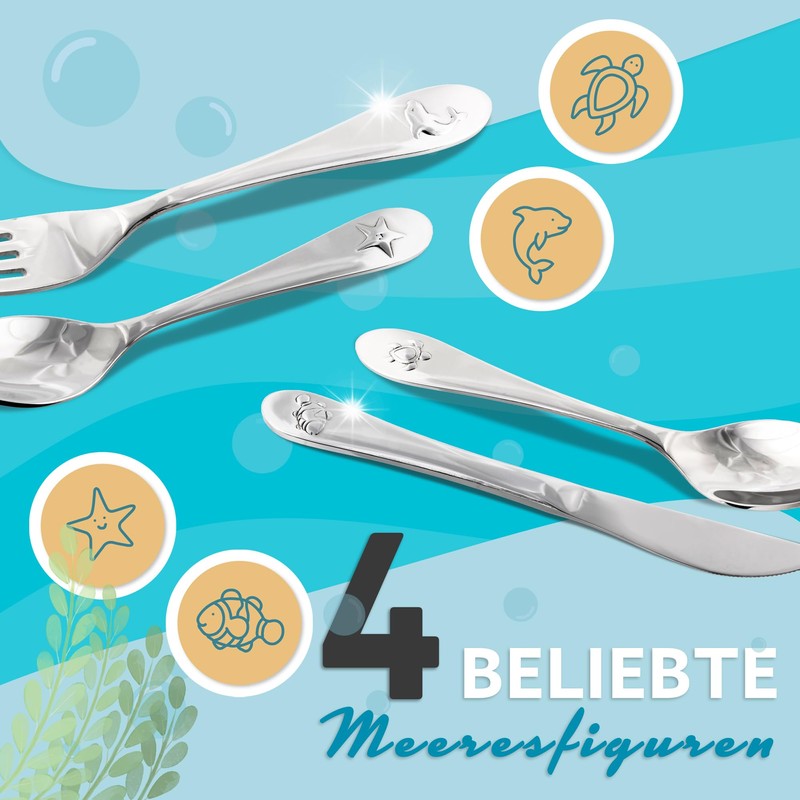 - 🐬 SÜSSE MEERESTIER-MOTIVE! Mit den 4 Meerestieren auf dem Kinder-Besteck macht jedes Essen Spaß. Auf den Griffen der Kinderbesteck-Teile sind bei Kindern beliebte Meerestiere abgebildet: ein Clown-Fisch, ein Delfin, eine Meeres-Schildkröte sowie ein lächelnder Seestern.