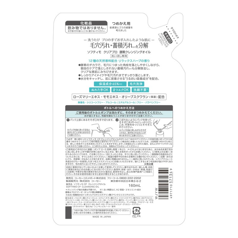 KOSE Softymo Clear Pro Enzyme Cleansing Oil, Refill, 5.3 fl oz (160 ml)