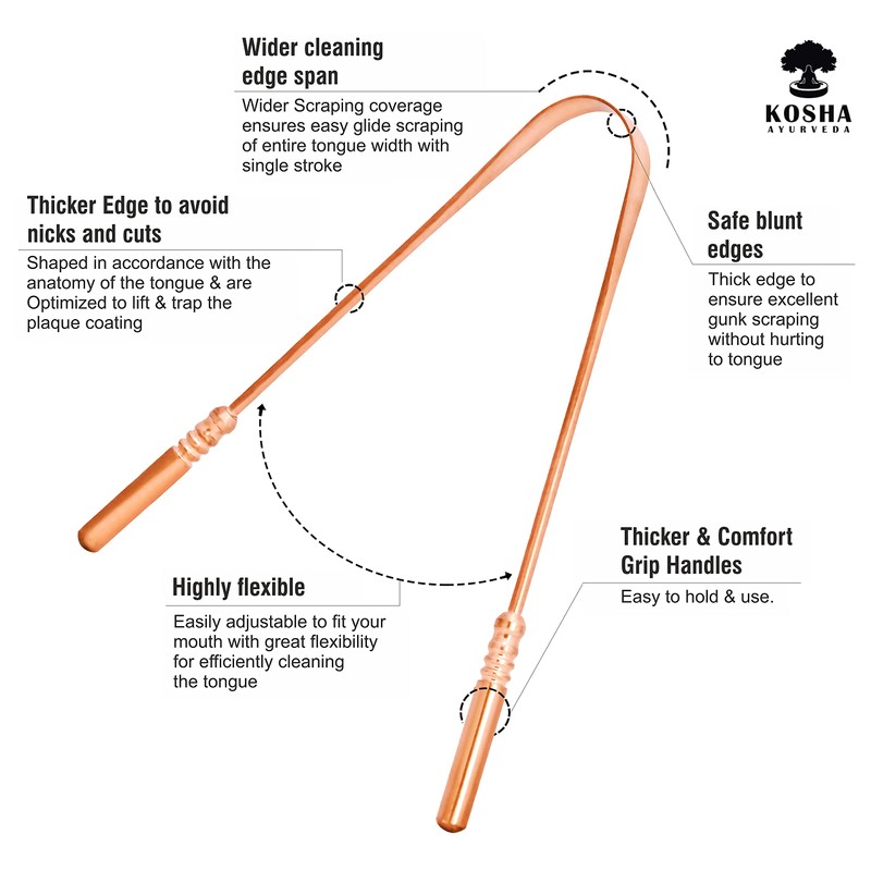 - WIDER CLEANING EDGES: Kosha Ayurveda’s Copper tongue scraper has a wide scraping edge, which allows you to scrape the entire tongue width with a single stroke. No area is left untouched, providing healthy cleaning to the entire tongue