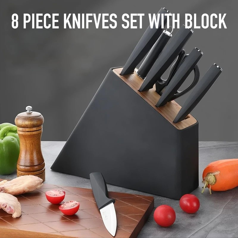 KOSHA Black Kitchen Knife Set, 8 Piece Knifves Set with Block, High Carbon Stainless Steel, Ergonomical Handle, Rust Proof, Non-Stick, Kitchen Accessories