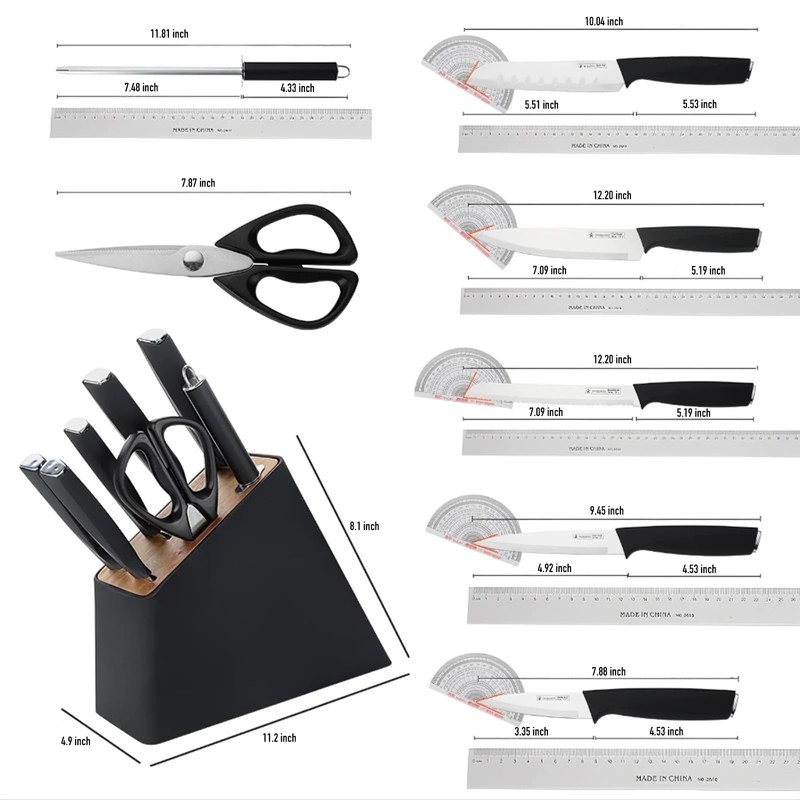 - Ventilated Knife Storage: Knife set with sharpener and sturdy PP block with wood-grain lid features angled slot. 4.9"x11.2"x8.1" compact size saves 30% more counter space than no block knifves set