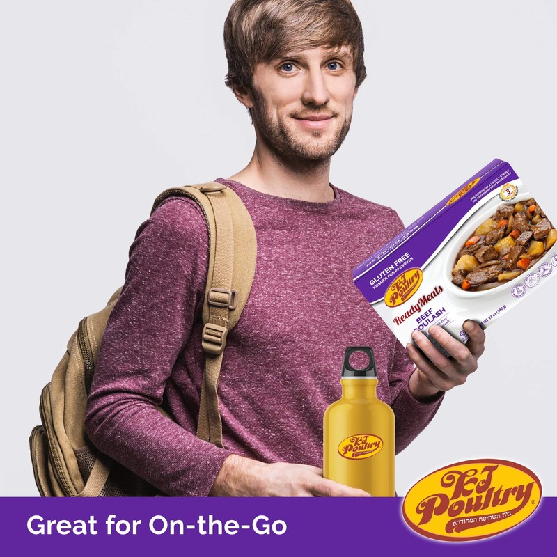 INTRODUCING OUR KOSHER FOR PASSOVER MEALS so that you can enjoy our easy-to- cook homemade meals during our special holiday! We use the finest ingredients and meet the strictest kashrus standards possible so that you can enjoy the most delicious kosher meals without sacrificing healthy nutrition. This meal is perfect for those who really want to have a traditional Passover home, but might not have the time or the skills to prepare a traditional tasty Kosher meal for Passover. Now let’s get into the specifics. **Want to know exactly what you get in our Kosher for Passover Beef Goulash Meal?** A rich beef stew with the most succulent beef pieces and the most savory vegetables. Sounds like the description a fine restaurant would give to it, right? Well, it tastes as fine as it sounds. **And how big is this meal, you may ask?** Each single meal includes a single serving (serving size 12 oz.) and has 230 calories. **Alright… And what about the ways to heat it up?** Well, there are four ways you can do it (that we know of): 1) Microwave Oven: The faster option. It's warmed up and ready in about 2 or 3 minutes, depending on the microwave. 2) Boiling Water: Place the product as is in boiling water, heat for approximately 7 - 10 minutes. 3) Hot Plate: May be heated on a Hot Plate. *Heat setting should not exceed 250°F. 4) Stove Top Blech: May be heated on a Shabbos Stove Top Blech. **Do you now want to know who’s behind these mouthwatering meals?** We are KJ Poultry… Nice to meet you! Our kosher processing plant is in New York State, Mid-Hudson Valley Region, we’ve grown into the largest kosher poultry plant on the Eastern Seaboard and we’re a family of 250 workers! Ready to meet us? Ready to taste our meals? _KJ Poultry Ready Meals!_
