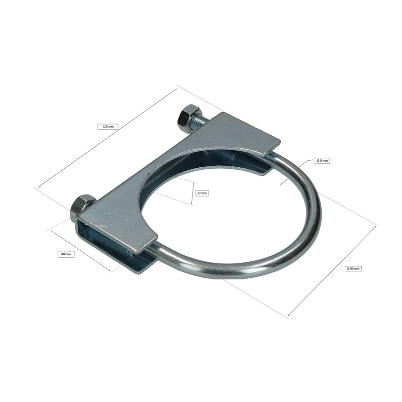 - Technical data – clamp 90 mm – inner diameter: 90 mm, U-angle diameter: 9 mm, thickness: 17 mm, width of clamp: 125 mm, length of clamp: 48 mm, weight: 297 g, material: galvanised steel, colour: silver