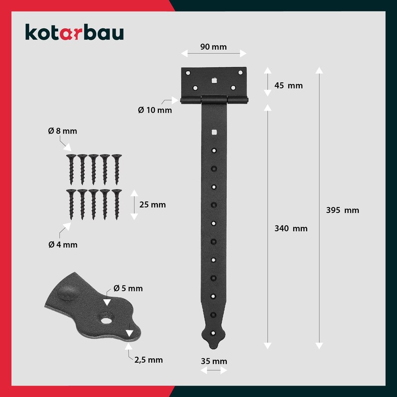 - Resistant: KOTARBAU door hinges are made of high-quality steel. The product ensures durability. The top quality of the product ensures protection against mechanical damage. The sturdy construction firmly holds doors and gates. The product has a very light design and shape. The high-quality materials protect against UV rays and rain.