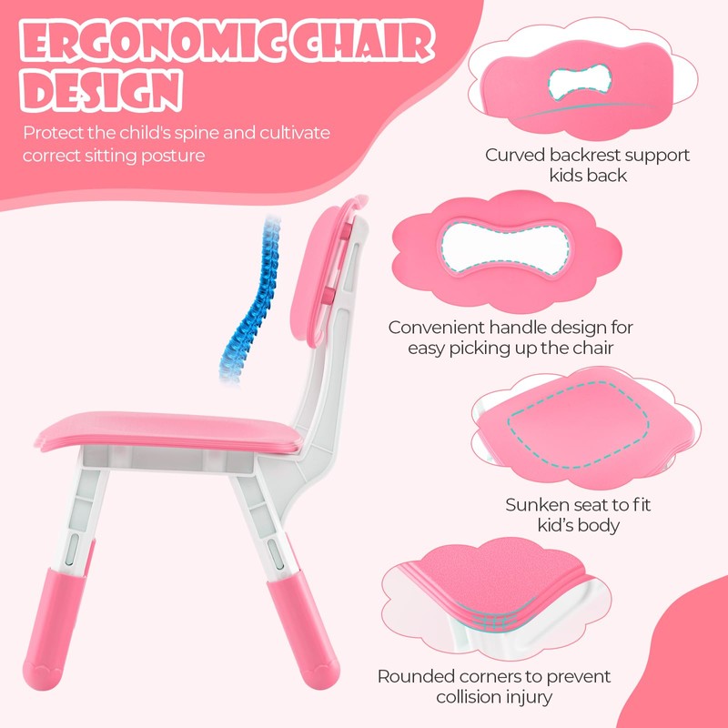 - 【Ergonomic Chair & User-Friendly Details】The sunken chair seat and backrest provide maximum comfort and support to protect children’s spine and correct their sitting posture, great to keep children from humpback. Besides, the edge of the tabletop is slightly raised to prevent children's items from falling off. This children art & crafts table and chair set ensures that your child can sit and focus on their activities for longer periods without any discomfort.