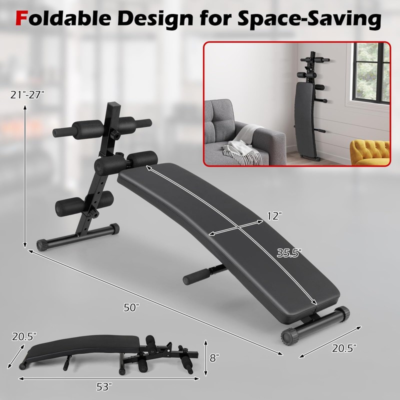 - [Ideal Home Gym Equipment]: Weighing only 15 lbs, This decline bench for abs is easy to move from place to place. The folding design enables it to be easily folded down to 53“ x 20.5” x 8” (L x W x H), allowing you to store it against a wall, under a bed, or beneath a sofa without taking up much space. With this versatile ab decline bench, home workouts have never been easier.