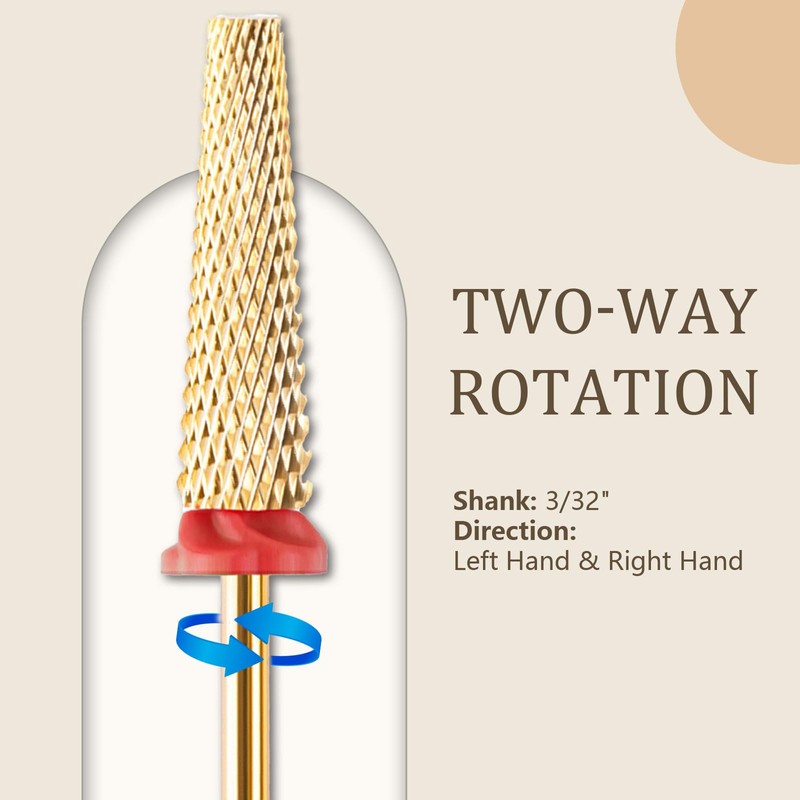 - 5-in-1 cross cut carbide nail drill: quantity: 1 piece | color: gold | grit: coarse | shank size: 24mm | direction: two-way rotation | users: beginner, experienced, nail technician, salon, etc.