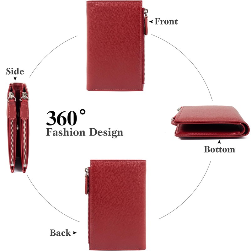 KOTORA Small Wallets for Women Leather RFID Blocking Bifold Zipper Coin Pocket Wallet Card Case Holder Minimalist Clutch Handbag Purse, Medium-Red, Bifold
