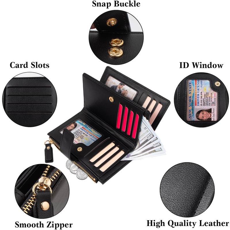 KOTORA Womens Small Wallets Leather RFID Blocking Bifold Zipper Coin Pocket Wallet Card Case Holder Minimalist Clutch Handbag Purse, Black, Bifold