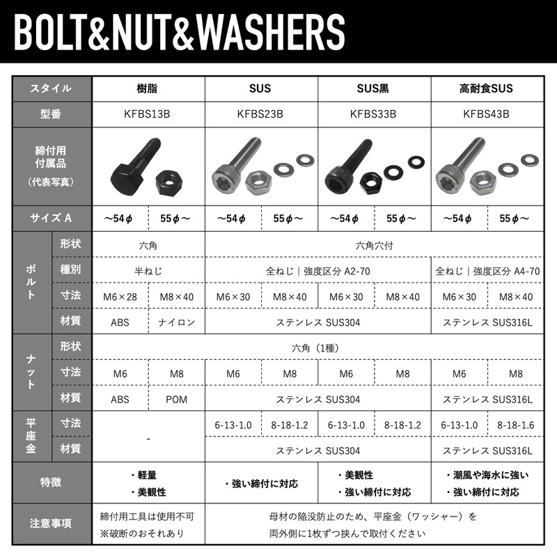 For resin bolt nuts, please install it by hand without using any tools to prevent the bolt from breaking.