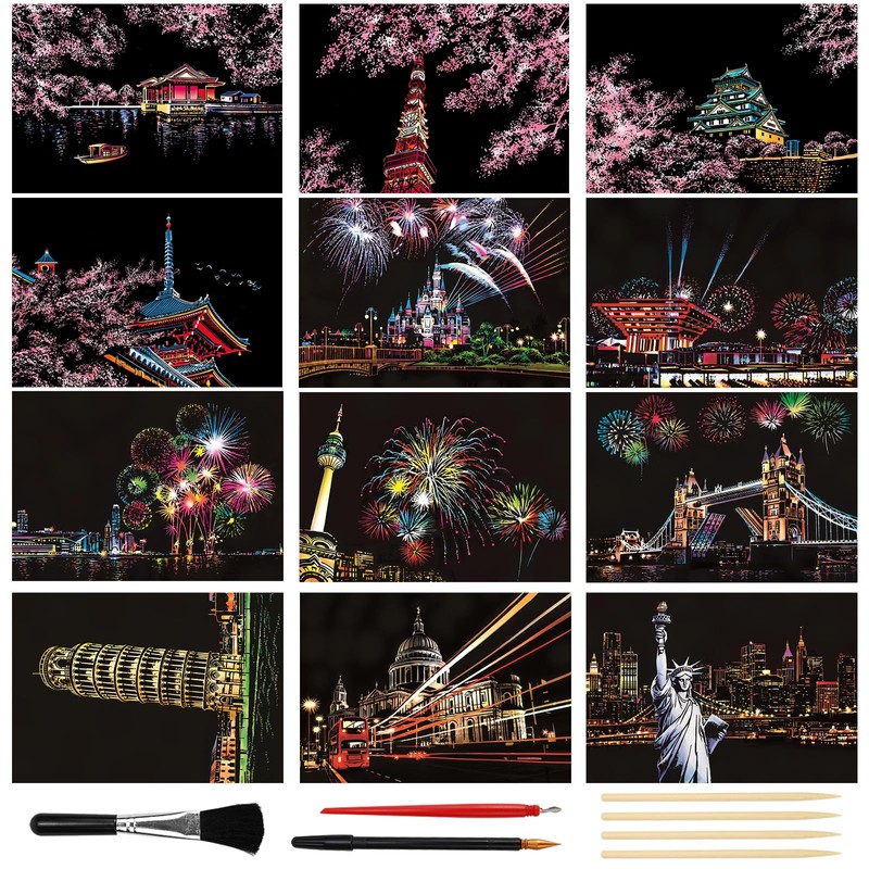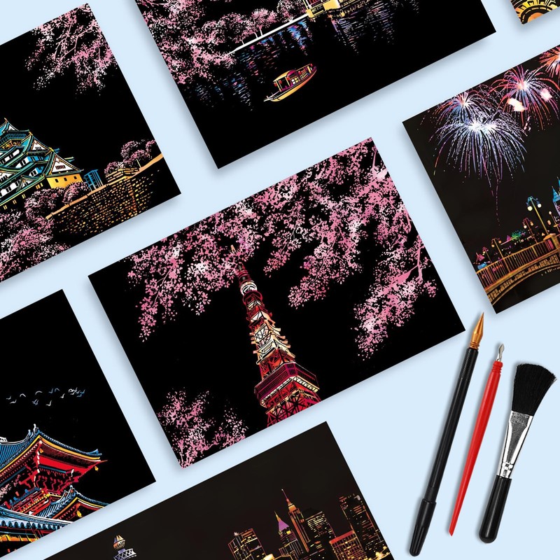 KOUHA Scratch Pictures, Fireworks and Cherry Blossoms, Scratch Paper, Magic Scratch Art Paper and Pen Set, Night View, Scratch Board, Scratch Paper, Scratch Pictures, Adults & Children, DIY Scratch