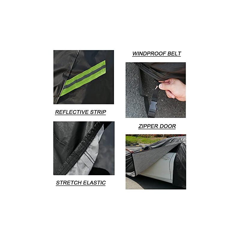 • Product Details--1. Driver side door zipper design 2. Windproof straps stop the cover blown away by heavy Wind 3. 6pc reflective stripes remind other people at night 4.Mirror pockets make the cover more suitable and easy to put on 5.Come with a waterproof bag you can easily fold the cover and carry it with you in the trunk.