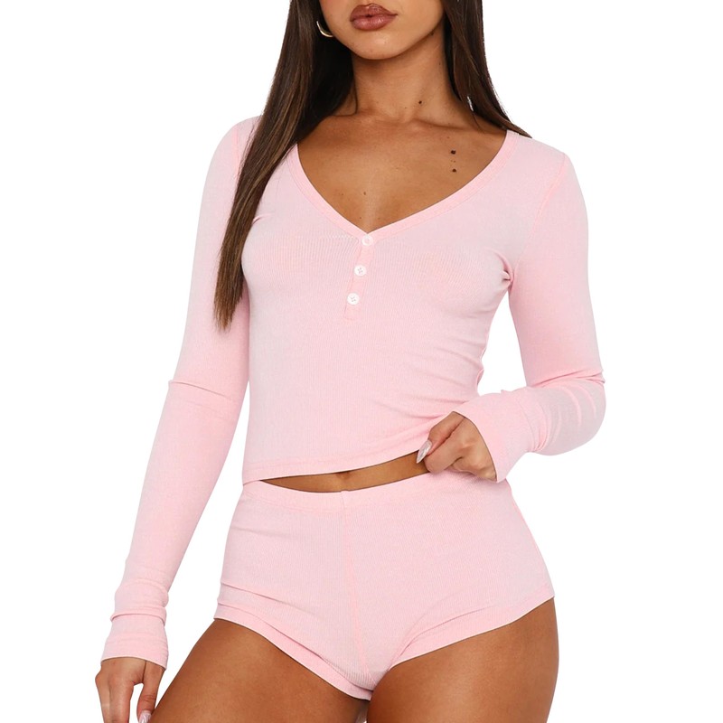 - 【Versatile Occasion】This Pyjama Femme 2 Pieces Feature A Simple And Stylish Design, Great For Party, Casual, Beach, Daily, Leisure, Workout, Sports, Sleeping, Shopping, Home Etc, Match With Slippers, Or As Separates, The Rib Long Sleeve V Neck Button Up Top And Shorts Are Y2k Clothes For Womens Fashion