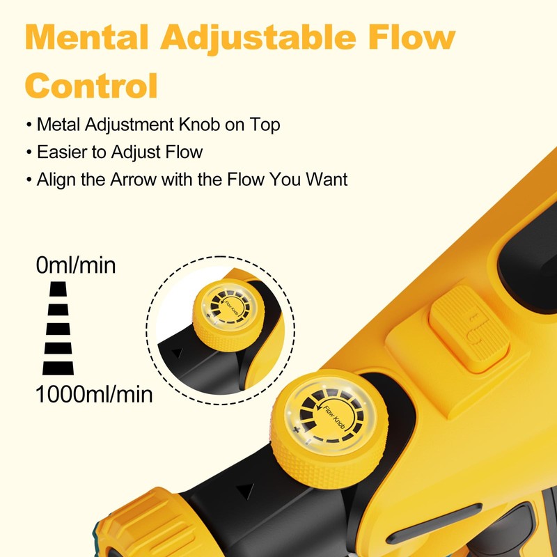 • Metal Adjustable Flow KnobJust align the arrow in front of the flow knob to get the flow rate you want. You can reasonably control the paint flow as required, achieve better spraying effects and avoid paint waste. The metal flow knob is designed on the top so you can adjust the flow rate more easily