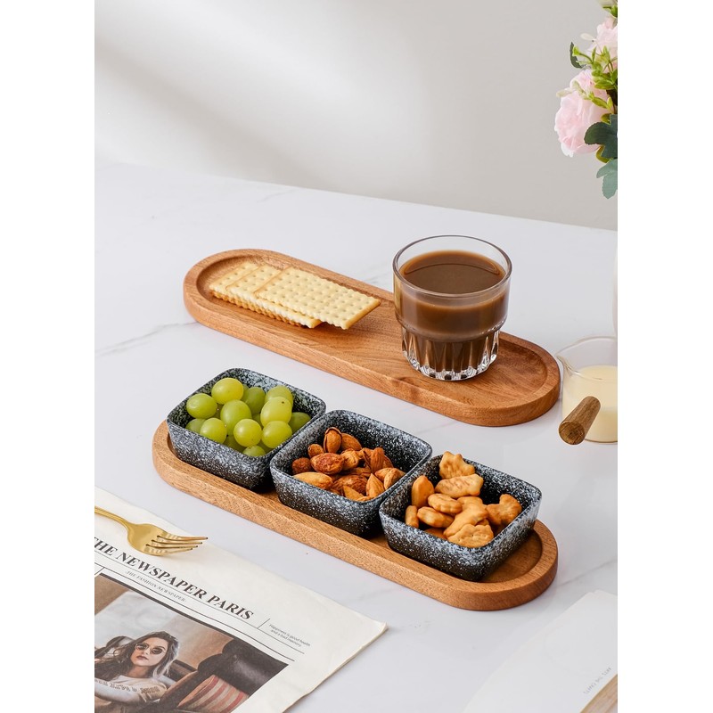 - 【Thoughtful Design】The wooden tray neatly organizes all three dipping bowls. Featuring grooved edges for easy handling, the bowls can be used together or separately as needed.