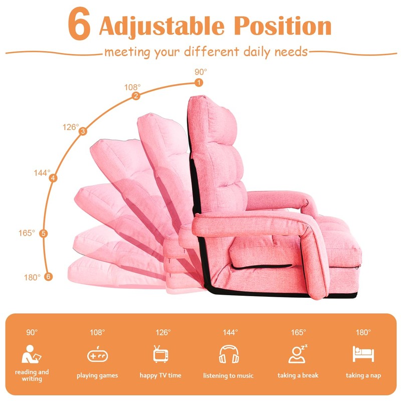 KOZIDO Floor Gaming Chair, 6 Position Adjustable Indoor Chaise Lounge Chair for Teens Adults, Padded Folding Meditation Sofa with Armrests and Pillow, Comfy Chair for Teens, Adults, Pets - Pink