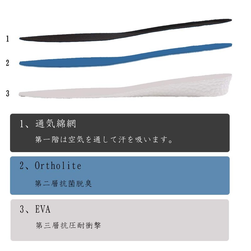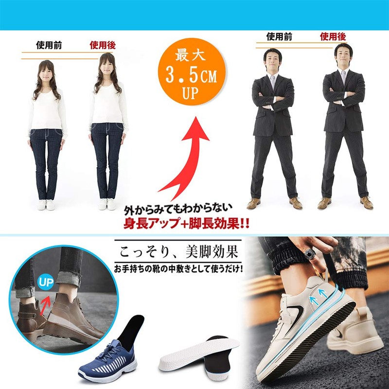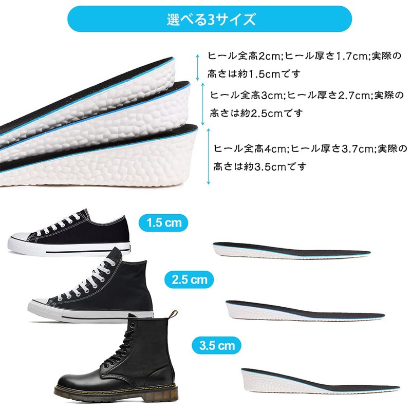 • 1、【インソール 身長アップ】中敷きとしてお手持ちの靴に入れるだけで簡単にヒールアップしてくれます。外から見てわからないまま、足が長く、姿勢良く、身長アップ & スタイル アップ することができます。高さは選べる3サイズ:1.5cm、2.5cm、3.5cm