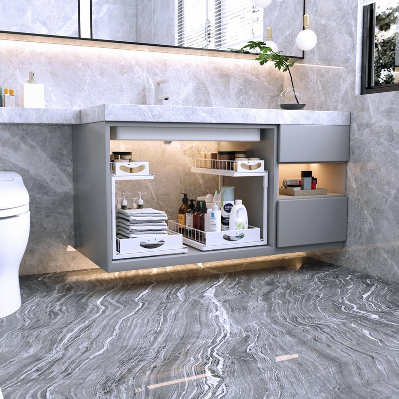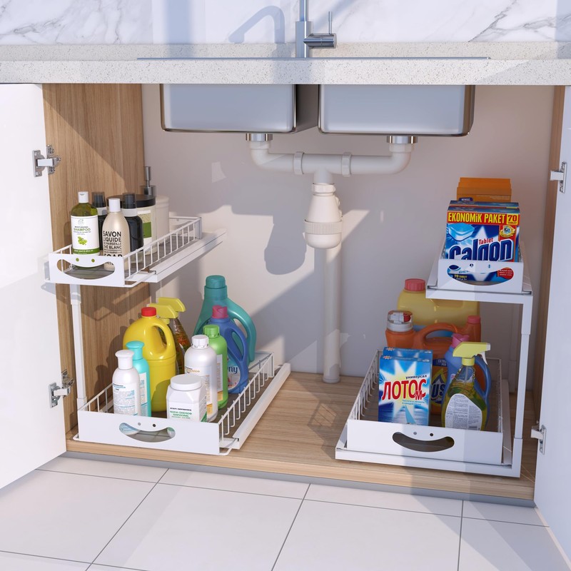 - L-shaped space-saving design: The pull-out storage rack for the sink is narrow at the top and wide at the bottom, allowing space for pipes and waste disposal. It increases vertical storage space in the sink cabinet, making it ideal for kitchens, bathrooms, and laundry rooms.