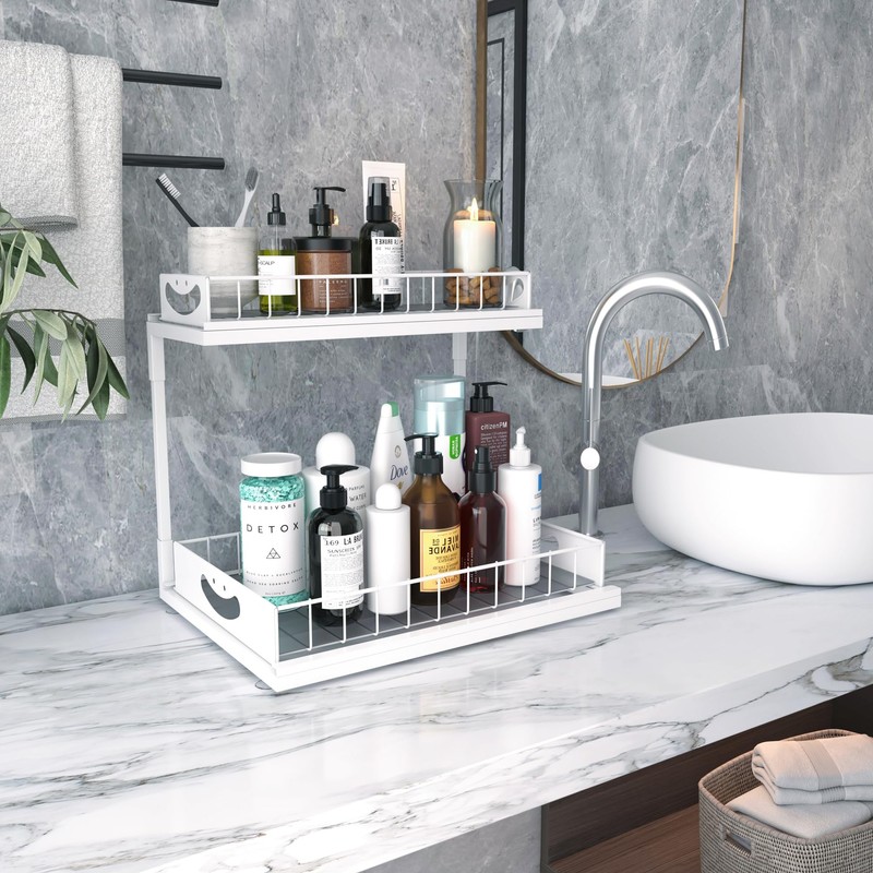 KPGRN Under Kitchen Sink Organizers,2-Tier Storge Rack with Sliding Drawers,Smiley Face Handle Storage Shelf,Multi-purpose Cabinet Organizer for Kitchen and Bathroom14.17X10.66 X 15.27 In(White,2Pack)