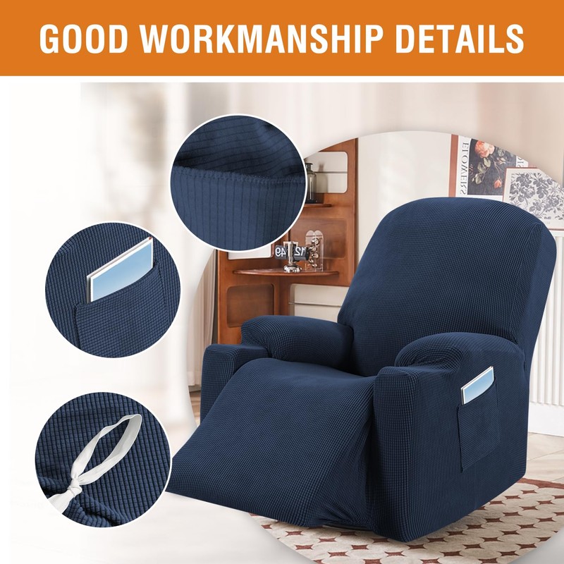 - STAY IN PLACE: The recliner cover has two elastic loops at the back corners to be pulled through to the back of the recliner, attach and fix the elastic loop to the component under the recliner. Designed with right side pocket for storing remote control, magazines, newspapers and other small items.