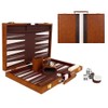 - Crafted in a 11" brown leatherette briefcase with gold latches & padded handle. Backgammon board game has the perfect tabletop game size for both casual and professional use.