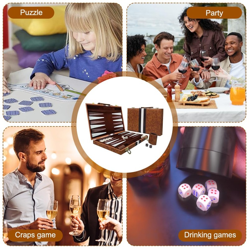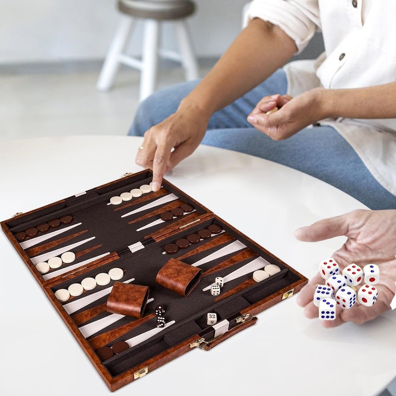 - ✔️【All-Inclusive Classic Set】To present you a complete and sophisticated gaming experience, this backgammon set comes with all the props you need to play the game: 1 x Backgammon Board + 30 x backgammon chips (15 of each colour) + 4 x regular dices + 1 x doubling dice + 2 x dice cups.