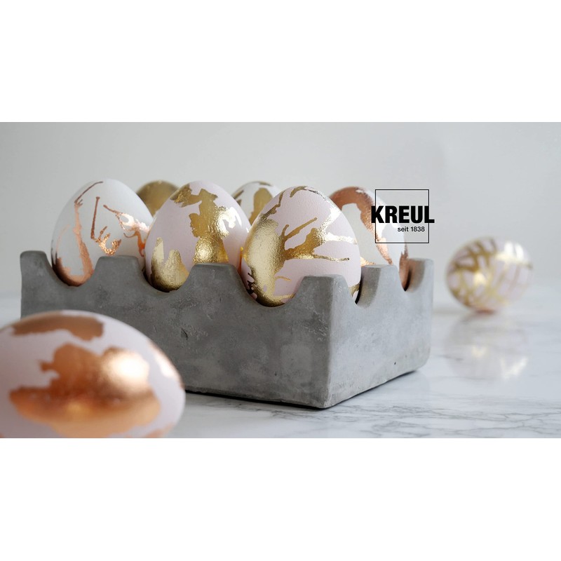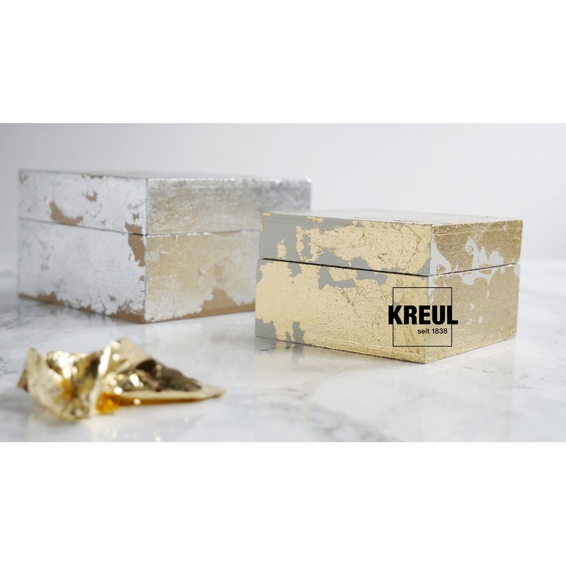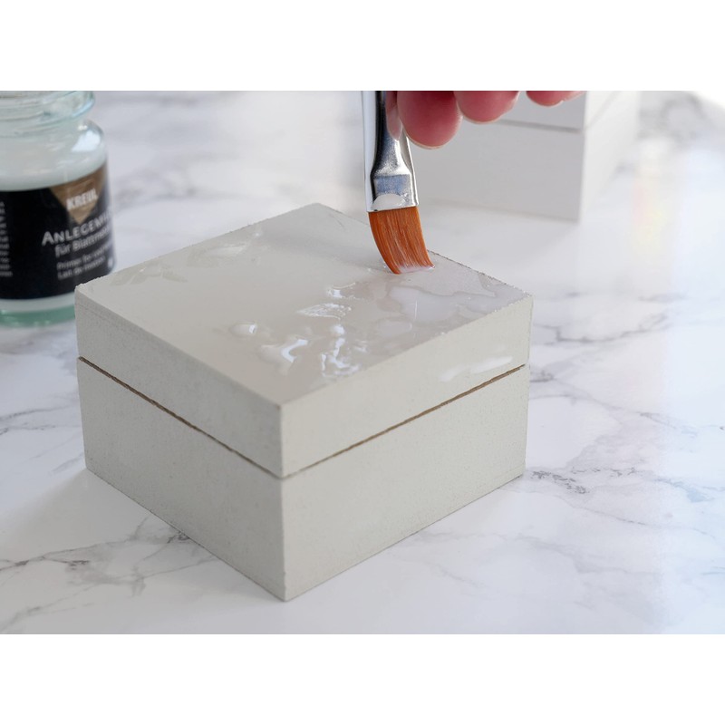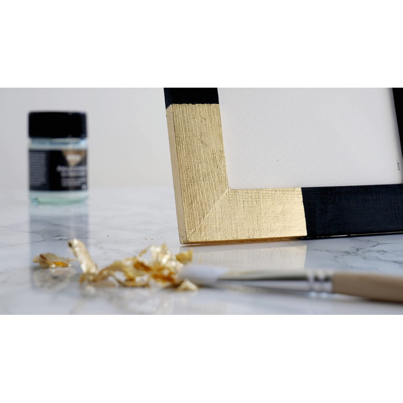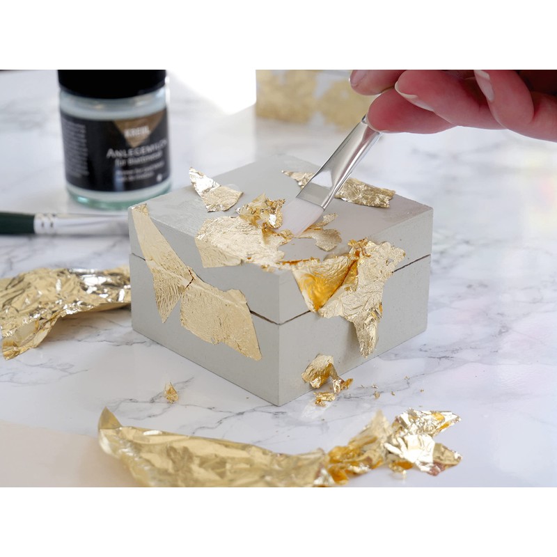 With the feeding milk, leaf metal flakes or leaf metals can be easily applied to a wide range of decorative objects for indoor use. This special adhesive is water-based and suitable for non-absorbent and absorbent surfaces. The plant milk is applied thinly to the clean and grease-free surface with a brush and is applied after approx. 20 minutes, depending on the surface, ready for 1 to 24 hours. With the help of a brush or cloth, the leaf metal or leaf metal flakes are gently applied to the surface and gently pressed. Remove any residue with a brush or cloth after ventilation.