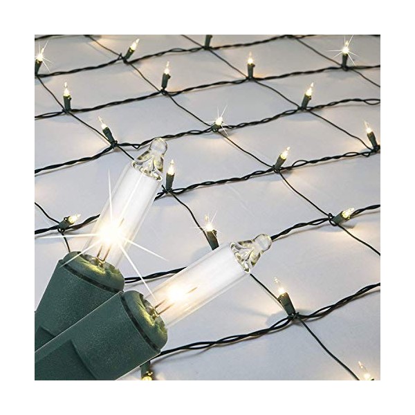 - [ CLEAR NON-TWINKLE INCANDESCENT NET LIGHTS ] Set of 150 clear steady incandescent mini lights on green wire. 24-inch lead with fused stackable male plug and 8-inch tail with female plug for easy end to end connections. Net measures 4’ x 6’ fully stretched.
