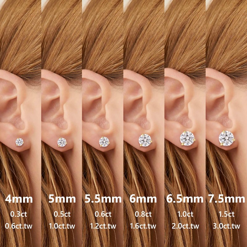 - 【Classic Style】KRKCLIFE stud earrings are set with sparkling moissanite diamond in brilliant round cut in 3-prong-setting. With perfect angular proportions and perfect mirror reflection, you can see the Heart & Arrow effect. Gemstone color: D, gemstone clarity: VVS1. Available in different diamond sizes. Gem diameter: 6.5mm; weight: 2.0 carat (a pair)