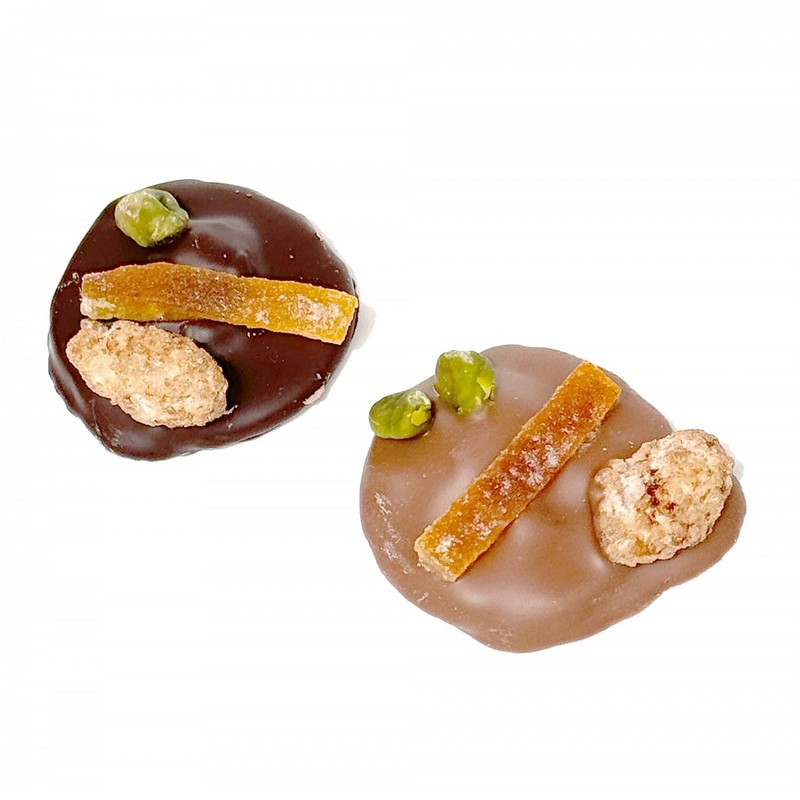 Elegant chocolate bowl in fine whole milk and dark chocolate covered with the finest candied Chinese ginger, candied French orange peel and burnt almond.