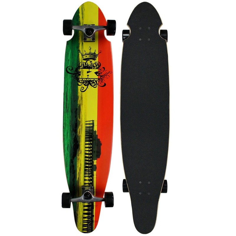 The deck is 9" x 43" with a 26" wheel base. This is a custom Krown shape with a round nose, front wheel cut-outs, and a kicked tail. Manufactured by one of largest longboard Makers. This is a pre-assembled complete. The trucks are Krown longboard trucks. This has Krown ABEC 7 bearings. The wheels are Krown 70mm 78a and gloss-black in color. Risers have been added help reduce wheel bite, and to give you one great smooth ride.