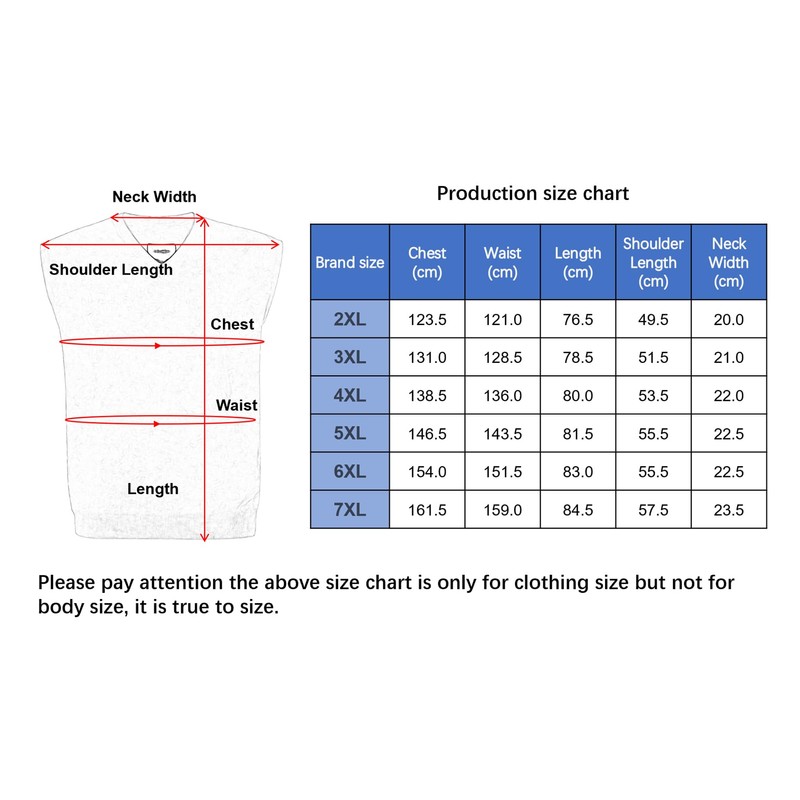 I.Costume Introduction: * Its loose fit ensures freedom of movement, making it easy to layer over casual outfits, business attire, or relaxed-inspired ensembles. Enjoy the warmth without the extra weight, whether you're at a business meeting, casual outing, or family gathering. * Lightweight and Comfortable: The vest is very light, 2XL weights arond 0.28kg, 3xl weights 0.3kg, 4xk weights 0.31kg,5xl wights 0.33kg,6xl weights 0.35kg and 7xl weights 0.38kg. II.Clothing Features: 1. Stay comfortable in any season with this breathable, medium-thickness sweater gilet. It's designed for winter, spring, fall, making it suitable for year-round wear, whether you're at home, traveling, or attending social events. 2. Good Fit for Plus Size: With sizes ranging from 2XL to 7XL, this sweater gilet provides a comfortable and flattering fit for big and tall men, boosting your confidence in any setting. 4. Stretch and Durability: Enjoy a flattering fit with stretchy fabric that accommodates all body types. The high-quality cotton knit ensures durability, so you can rely on this gilet for seasons to come. III.Usage Scenarios * Special Events and Gatherings: Pair this sweater gilet with your favorite shirt, coat, and jeans for a stylish look suitable for business settings, outdoor activities, dates, parties, weddings, and celebrations like birthdays and anniversaries. * Ideal for Golf: Enjoy the loose fit and cozy feel of this gilet while golfing, walking, or participating in other outdoor activities. It's designed to keep you comfortable and stylish on the go. * Professional and Office Wear: Elevate your work attire by layering this V-neck sleeveless pullover over a collared shirt and pairing it with dress pants. Ideal for business meetings, office presentations, and everyday professional settings.