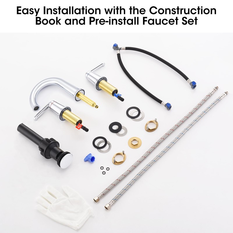 - 【UNIQUE HIGH ARC DESIGN WIDESPREAD BATHROOM FAUCET】 Bathroom faucet constructed from solid brass, meets NSF 61 lead-free standards. Drip-free ceramic valves passed 500,000 watertight tests and 24h extreme cold and hot tests, ensuring lifetime durability and reliability. Includes 23.62-in pre-assembled cUPC chrome bathroom faucet water supply lines and matching-finish pop-up bathroom sink drain with overflow.
